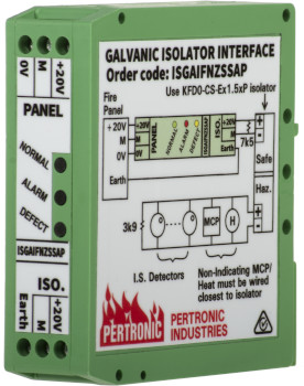 The Pertronic ISGAIFNZSSAP Galvanic Isolator Interface connects one galvanically-isolated detection circuit to a conventional detection zone. It may be used with the Pertronic F1, F4, F16e, and the Pertronic loop responder.